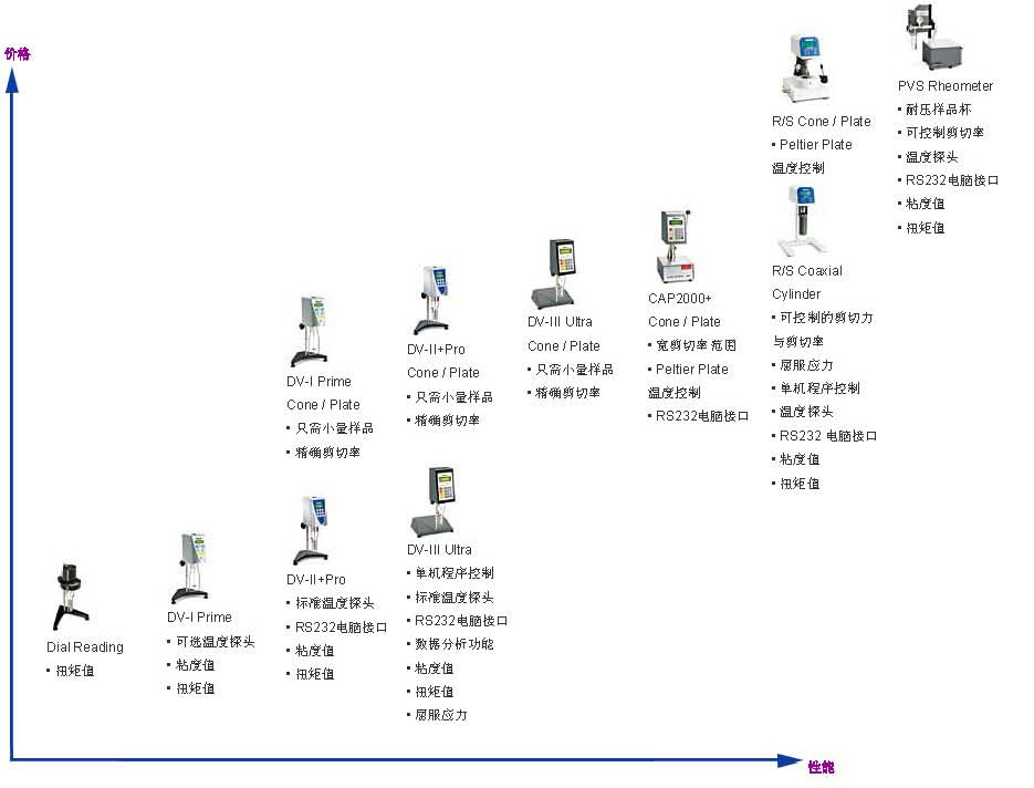 此圖為用戶提供一個(gè)關(guān)于Brookfield系列粘度計(jì)/流變儀的簡單直觀的介紹。這有助于您在決定購買Brookfield儀器之前有一個(gè)大概的了解。橫坐標(biāo)表示儀器的性能由低到高,縱坐標(biāo)則表示儀器的價(jià)格排列次序。