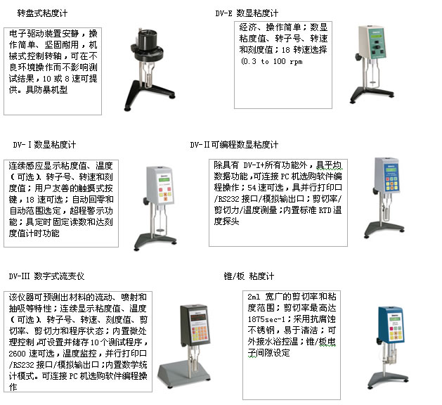 Brookfield標(biāo)準(zhǔn)粘度計(jì)和流變儀的機(jī)型選擇表在下方,包括有表盤粘度計(jì)、DV-I Prime、DV-II+Pro和DV-III Ultra。在您做最后的選擇之前,我們建議您參考與您相同行業(yè)里的人所使用的Brookfield粘度計(jì)的情況,這樣您的數(shù)據(jù)結(jié)果才能很好地與他們進(jìn)行比較。